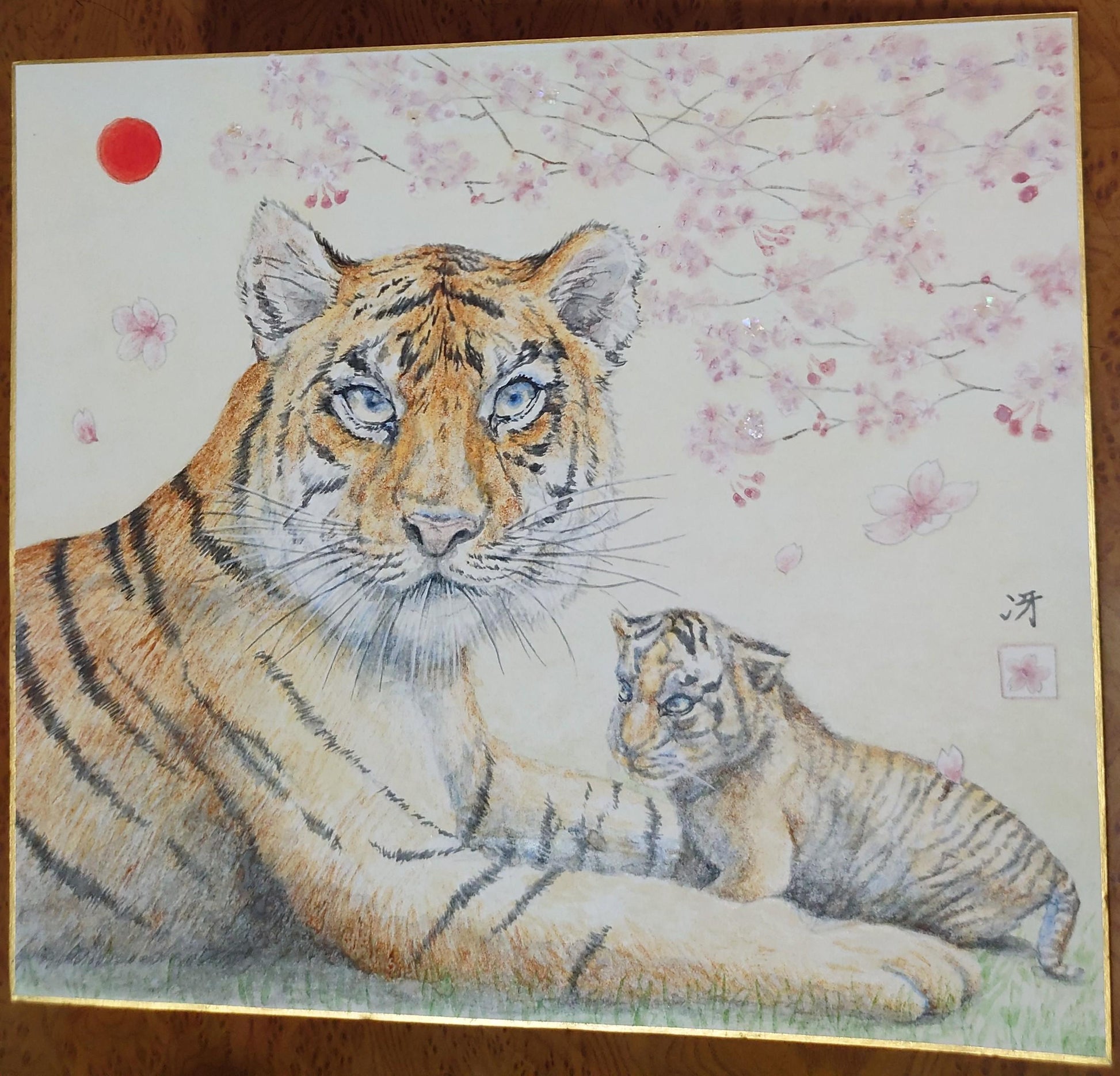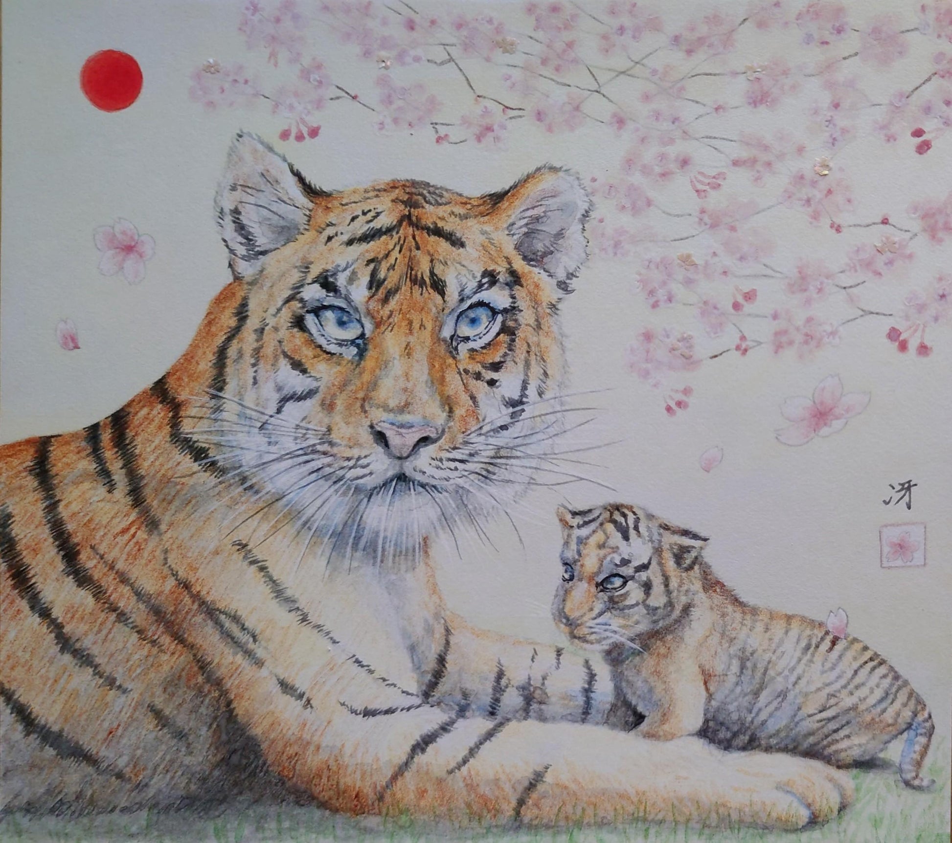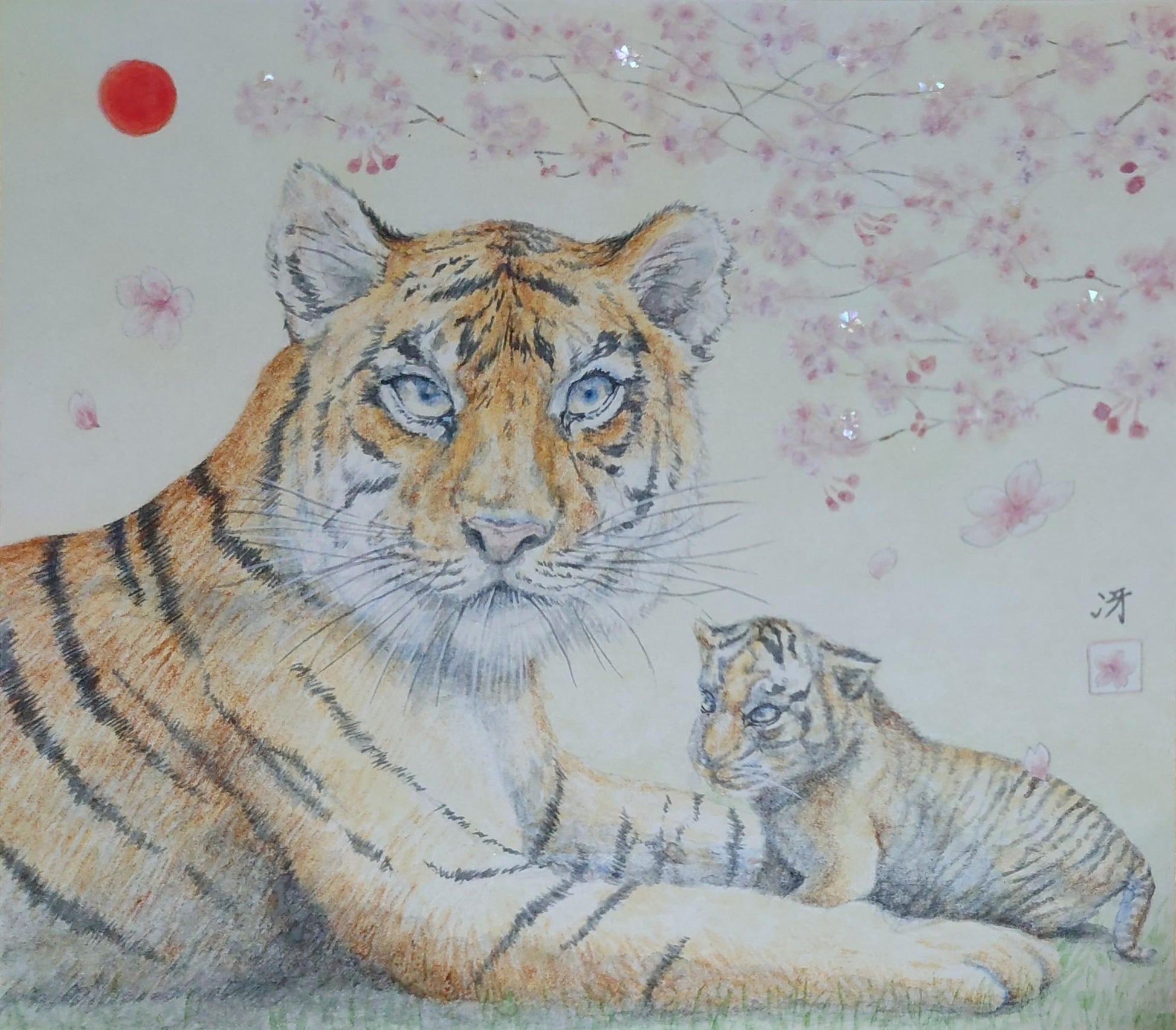 Japanese painting. Made with mother-of-pearl. Ink is "Ranjatai". Under the cherry blossoms, the mother tiger is filled with joy and love for the birth of her newborn cub and the beginning of a new life. The cherry blossoms and the mother tiger and cub symbolize the beautiful season of spring, when plants and animals are overflowing with various vitality, and the preciousness of life.