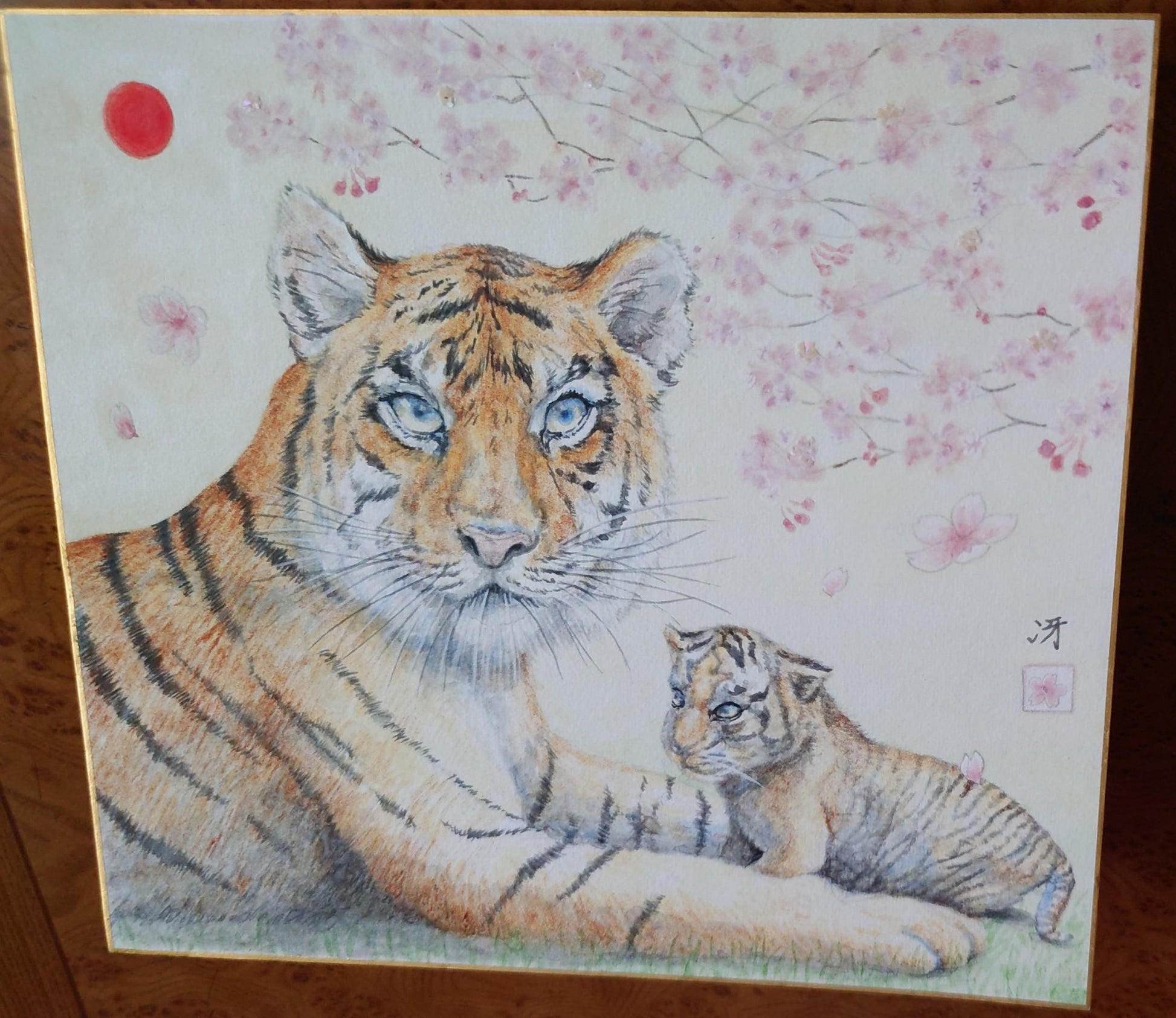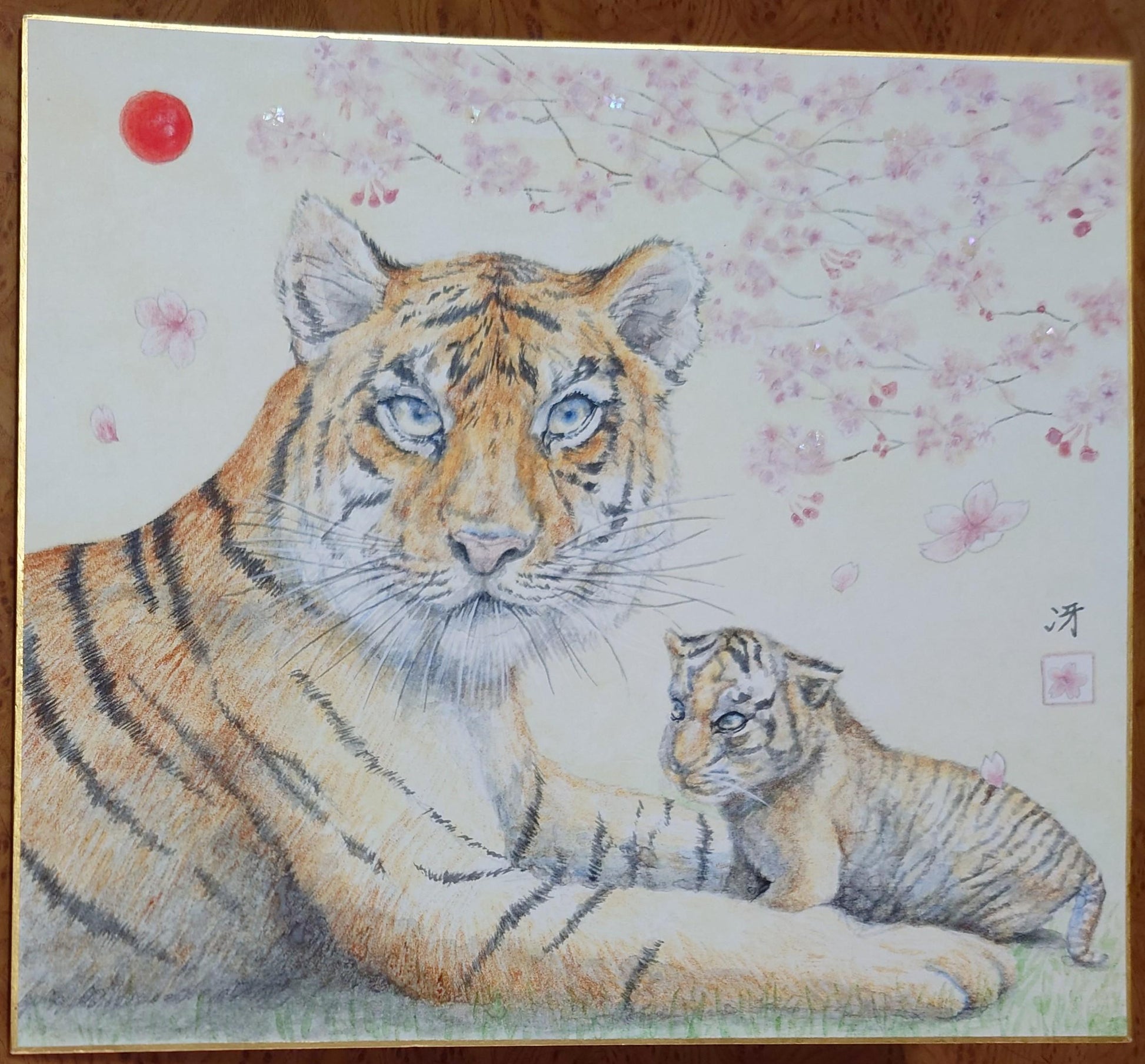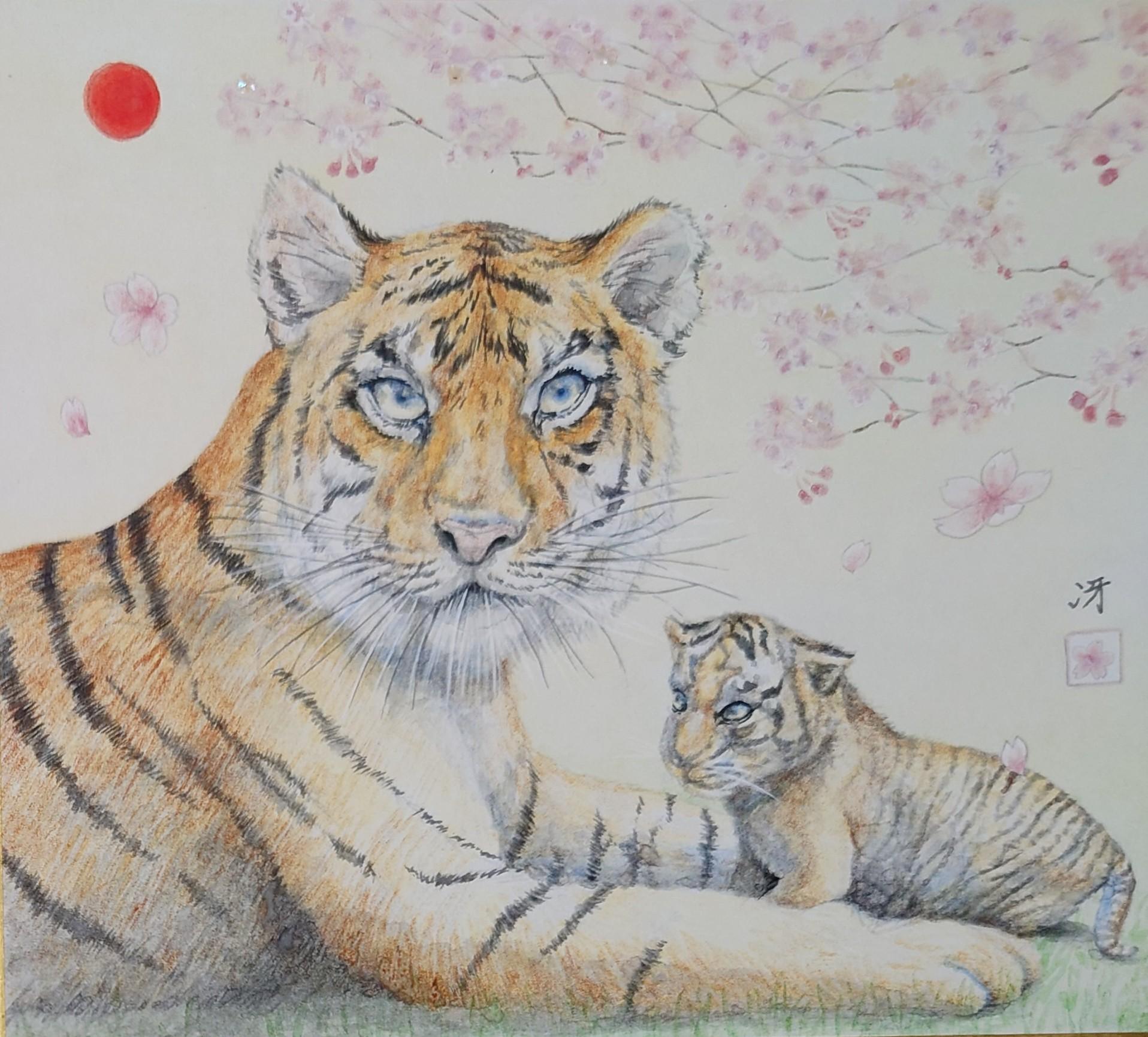 Japanese painting. Made with mother-of-pearl. Ink is "Ranjatai". Under the cherry blossoms, the mother tiger is filled with joy and love for the birth of her newborn cub and the beginning of a new life. The cherry blossoms and the mother tiger and cub symbolize the beautiful season of spring, when plants and animals are overflowing with various vitality, and the preciousness of life.