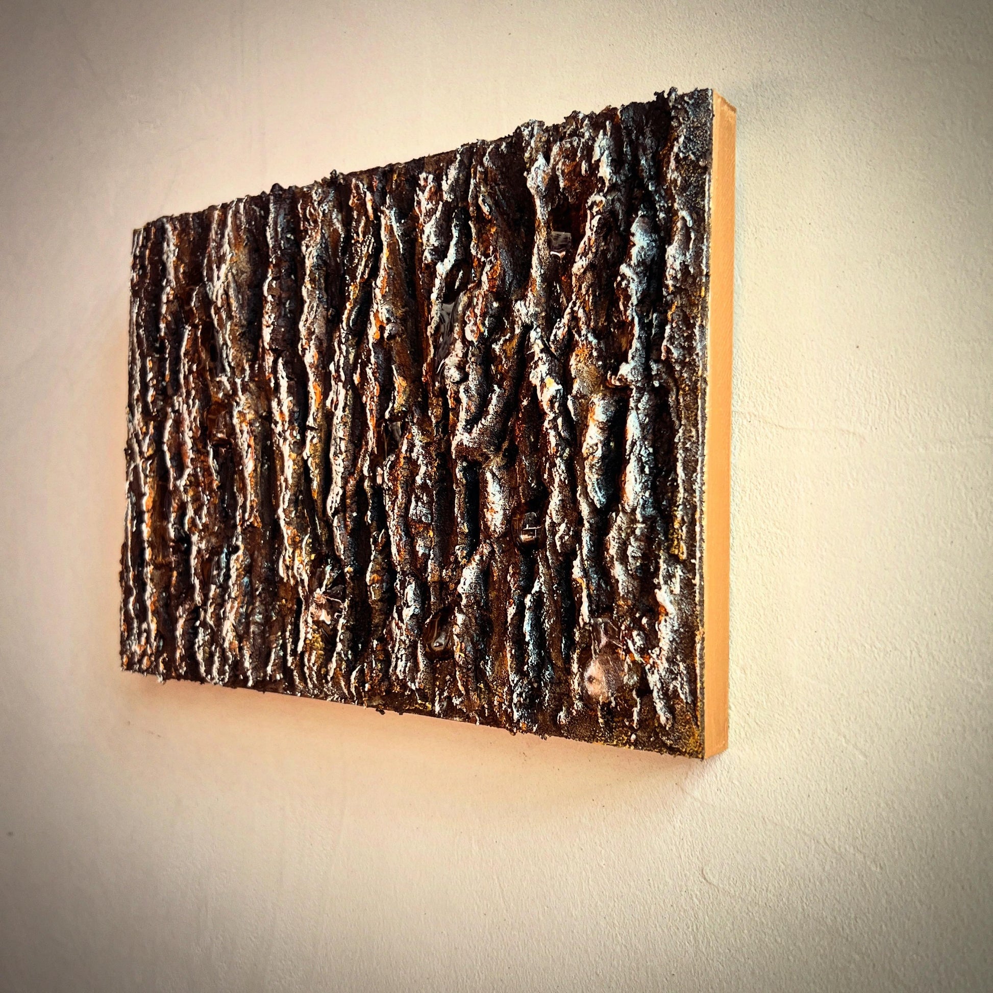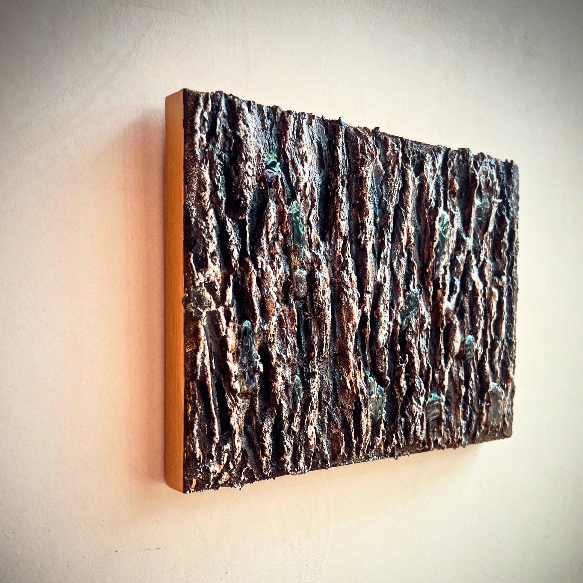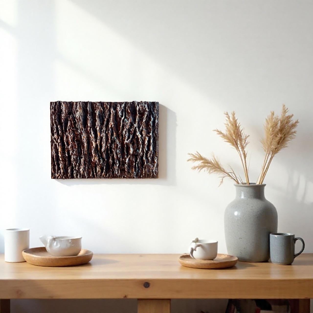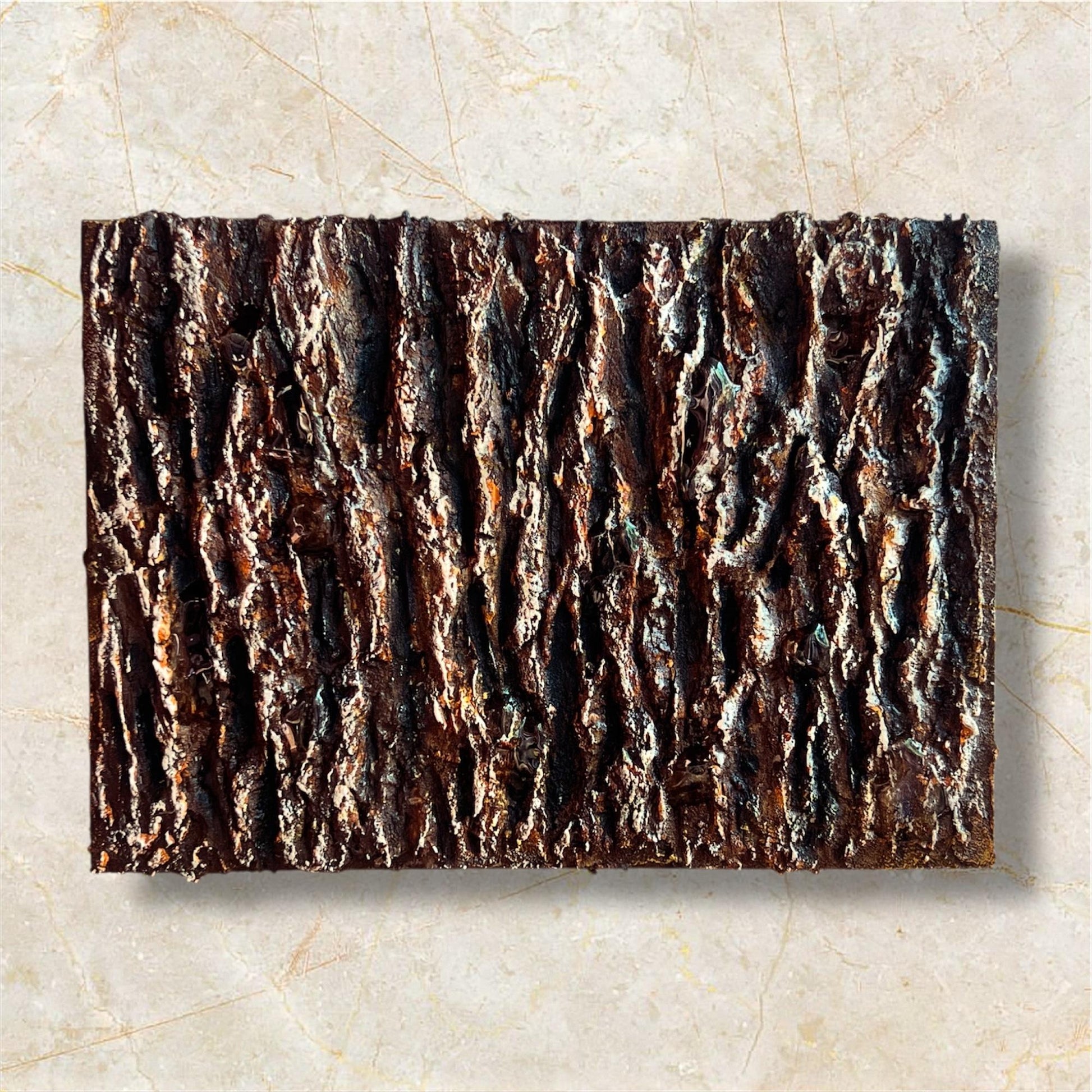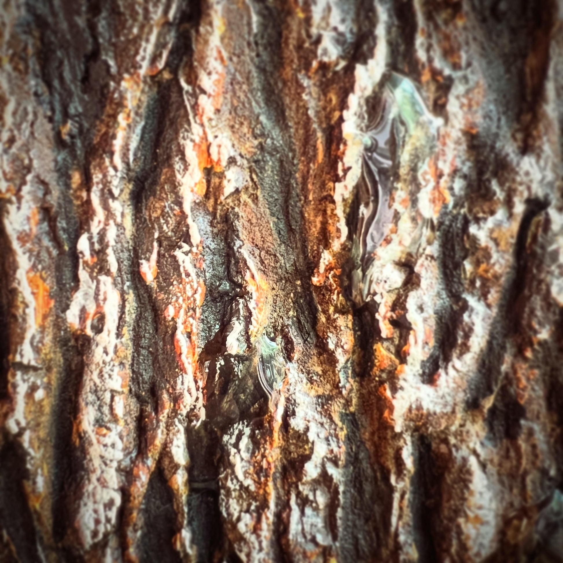 雨上がりの森で、木の幹に残ったしずくが静かに光る瞬間を切り取ったテクスチャーアートです。