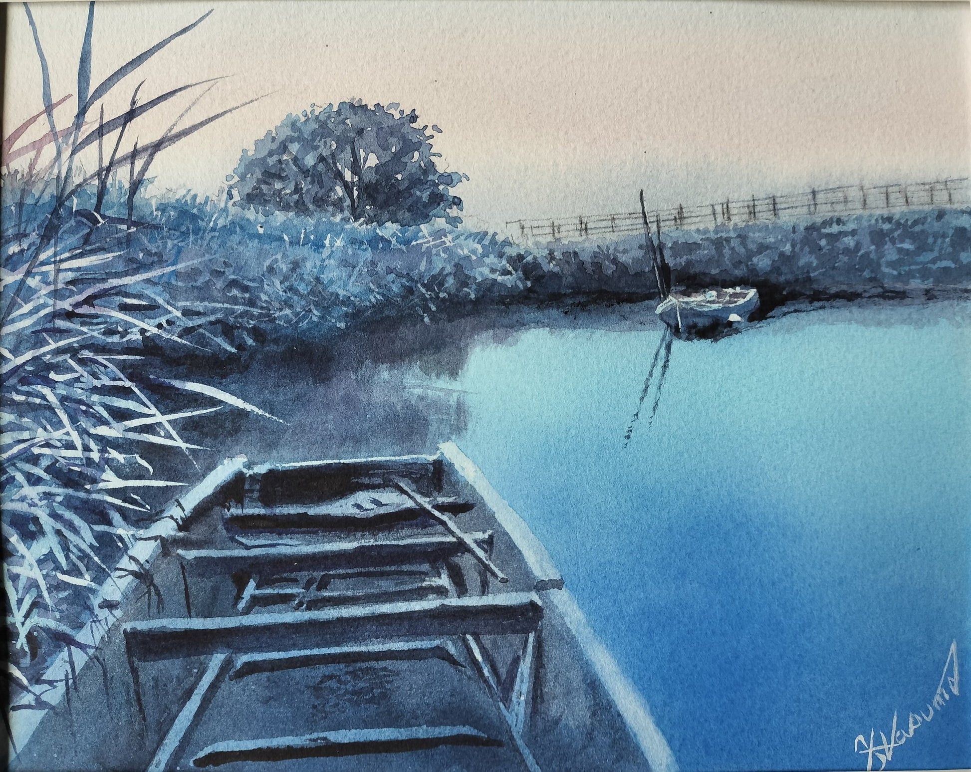 明るくなりつつある沼地の朝の景色を描きました