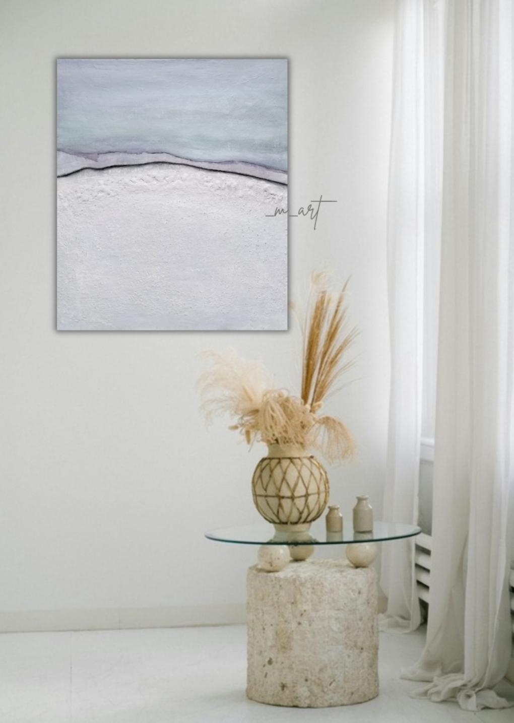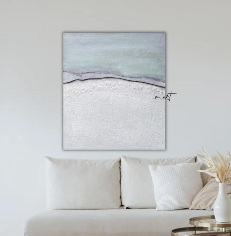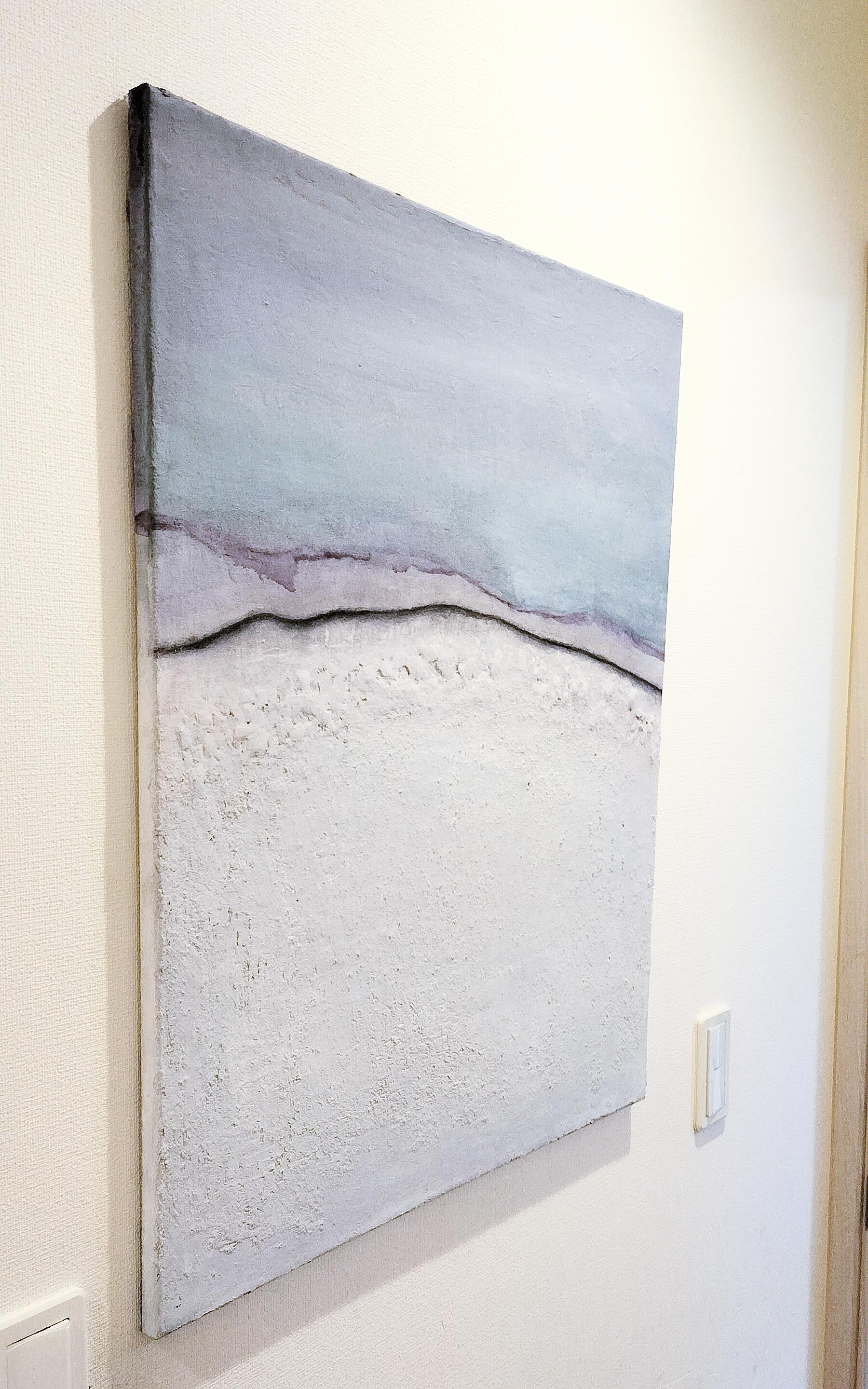 天然漆喰に卵の殻やコーヒー粉を独自配合したテクスチャーと、大地や空、水を思わせる繊細な色彩が融合した一点物です。