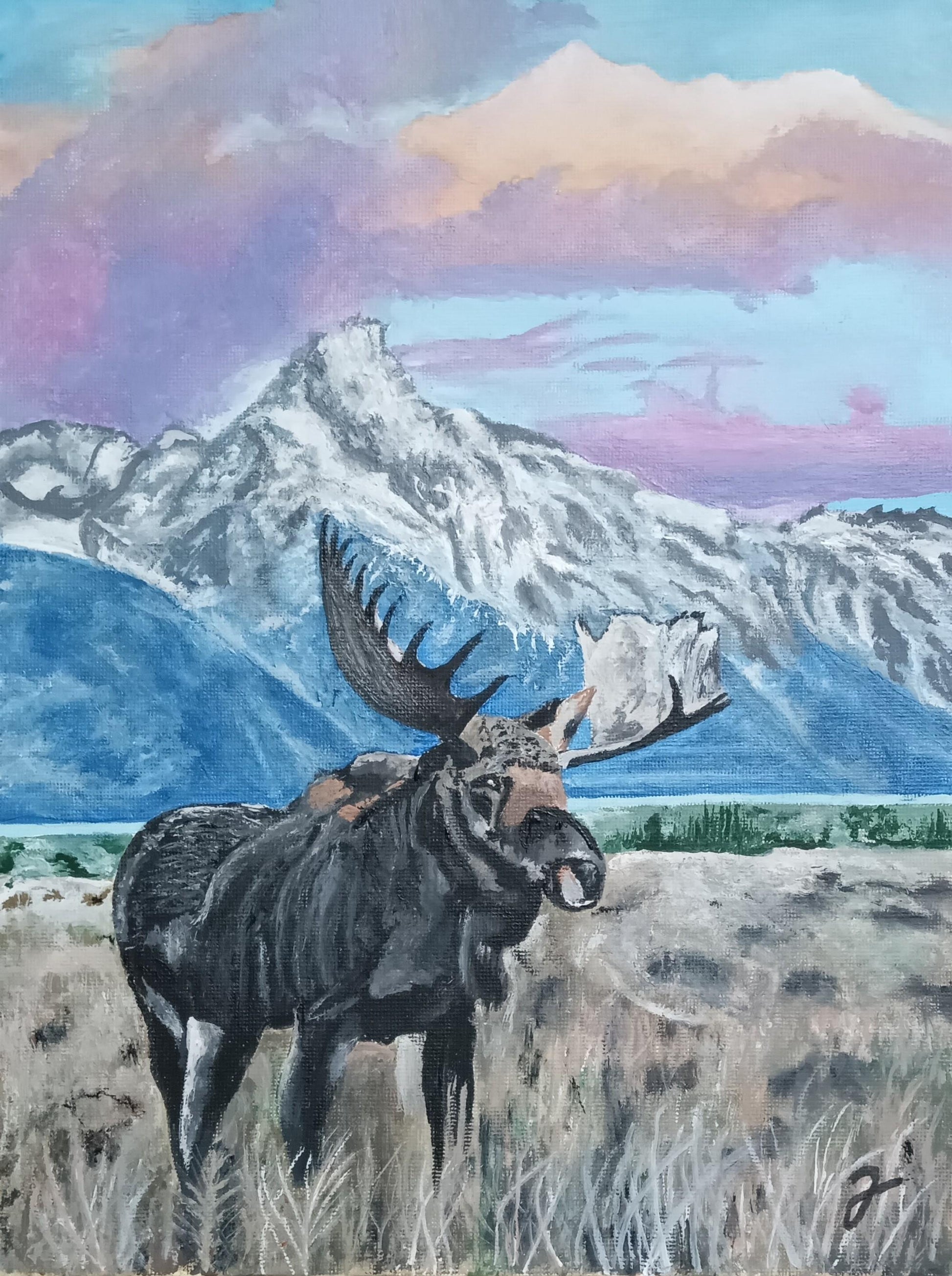 冷たく透き通る山の空気の中、ヘラジカが力強く大地に立ち、息づかいが聞こえてきそうな作品。 淡い色彩で描かれた空と湖、重厚な山の陰影が、自然の壮大さと繊細さを同時に表現しています。生命の鼓動と大自然の静けさが調和した、詩的な世界観が魅力です。