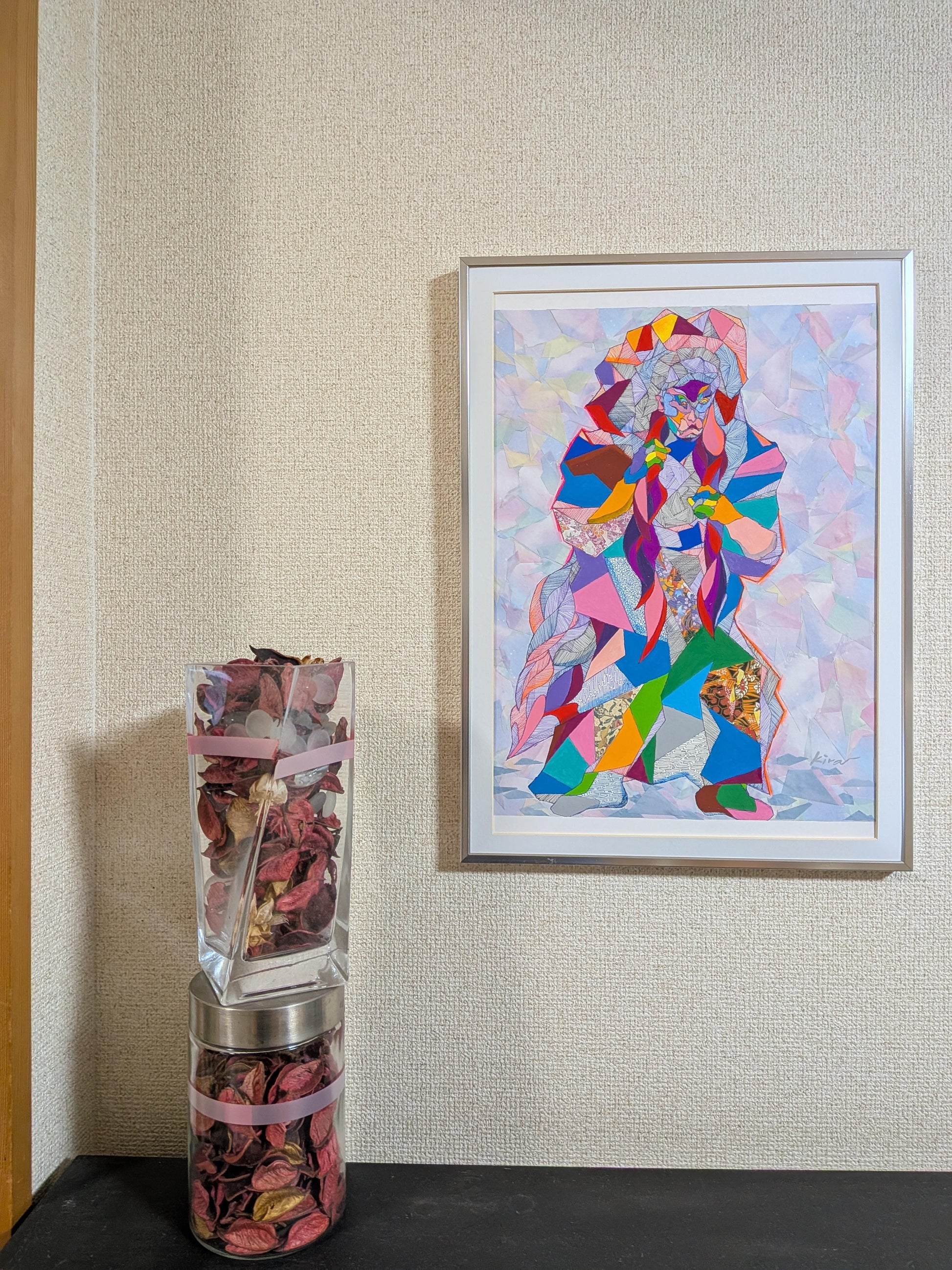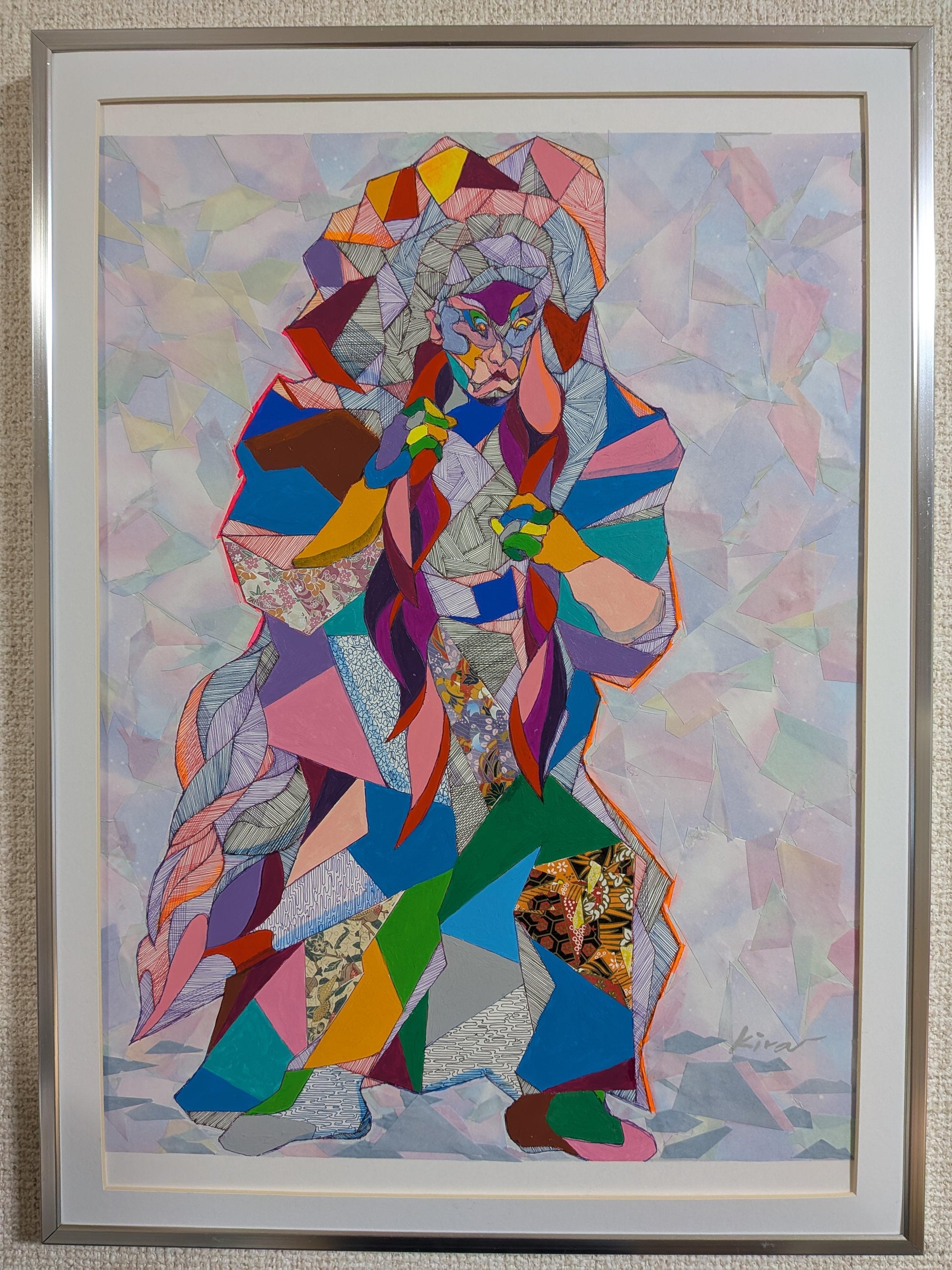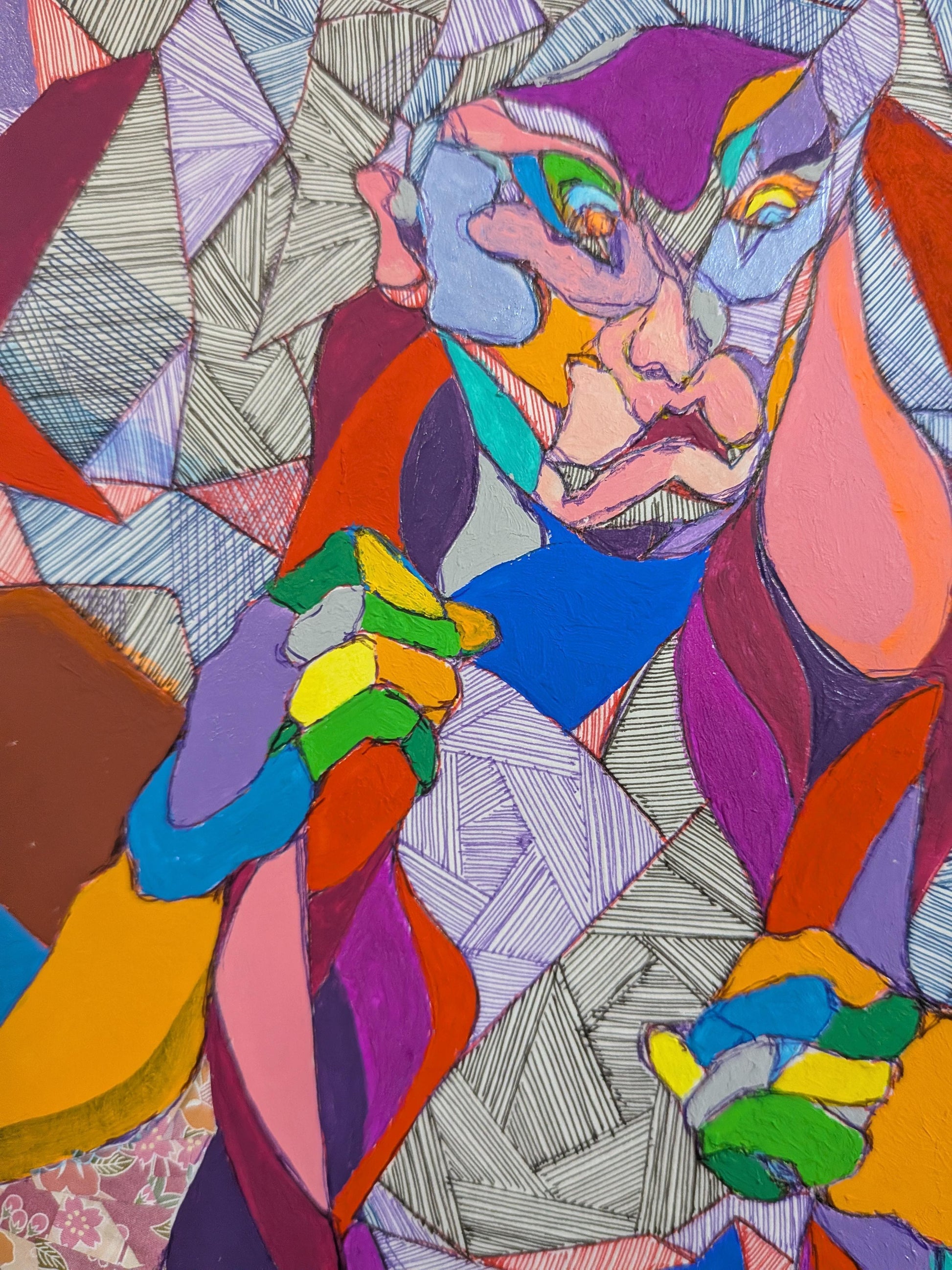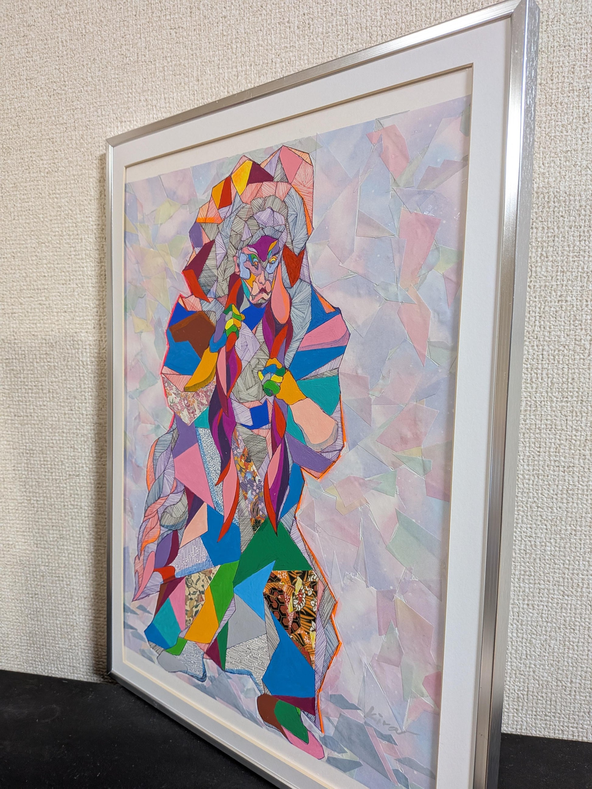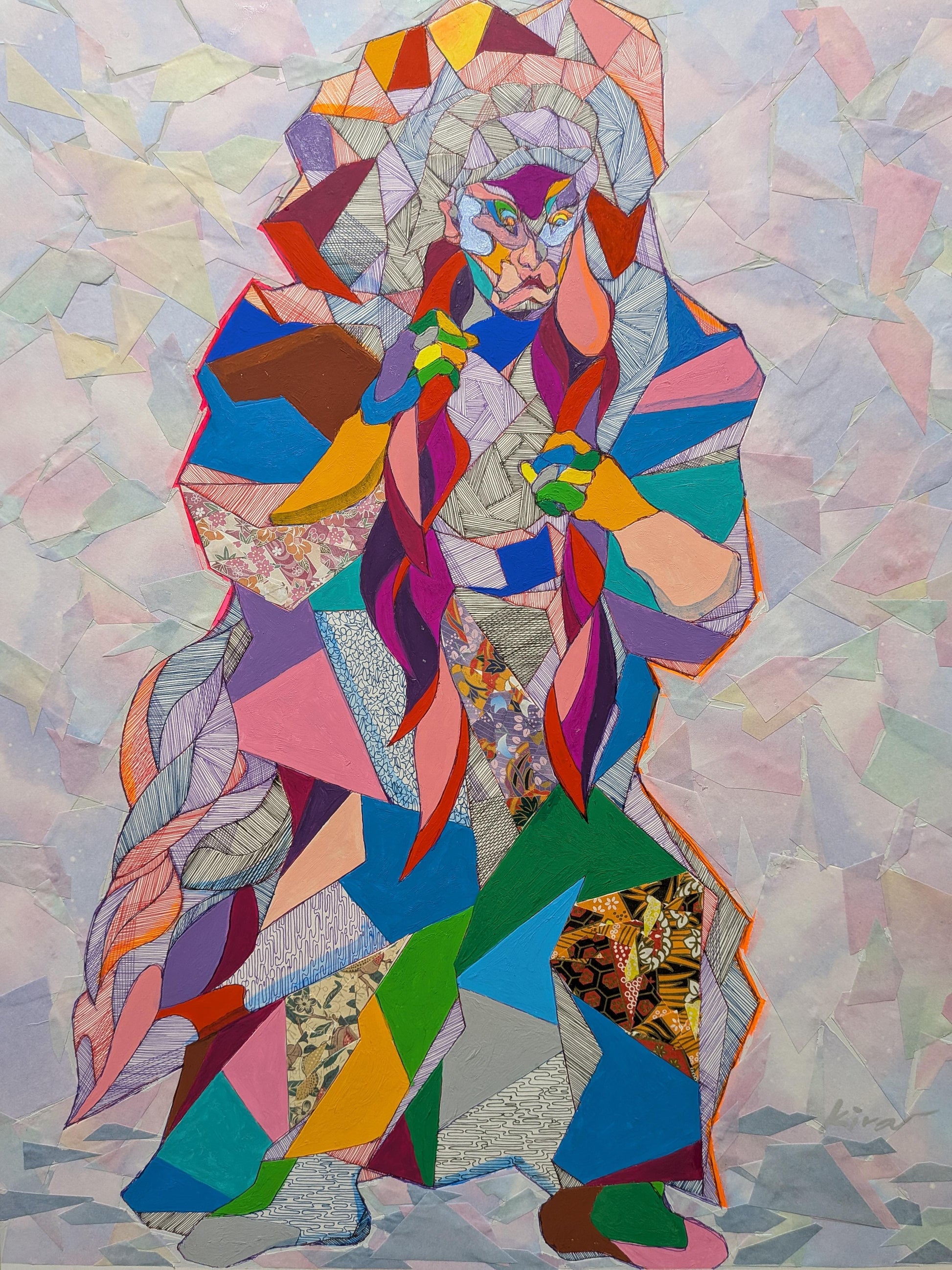 この人物は、ひとつの形として存在しているのではなく、 無数の断片によって支えられています。 色、線、模様は感情や記憶、時間の層を象徴し、 それらが崩れそうになりながらも、 なお立ち上がろうとする意志を形づくっています。 分解と再構成を繰り返す中で、 人は初めて「自分自身の輪郭」を獲得します。 この作品は、完成された姿ではなく、 立ち続ける過程そのものを描きました。