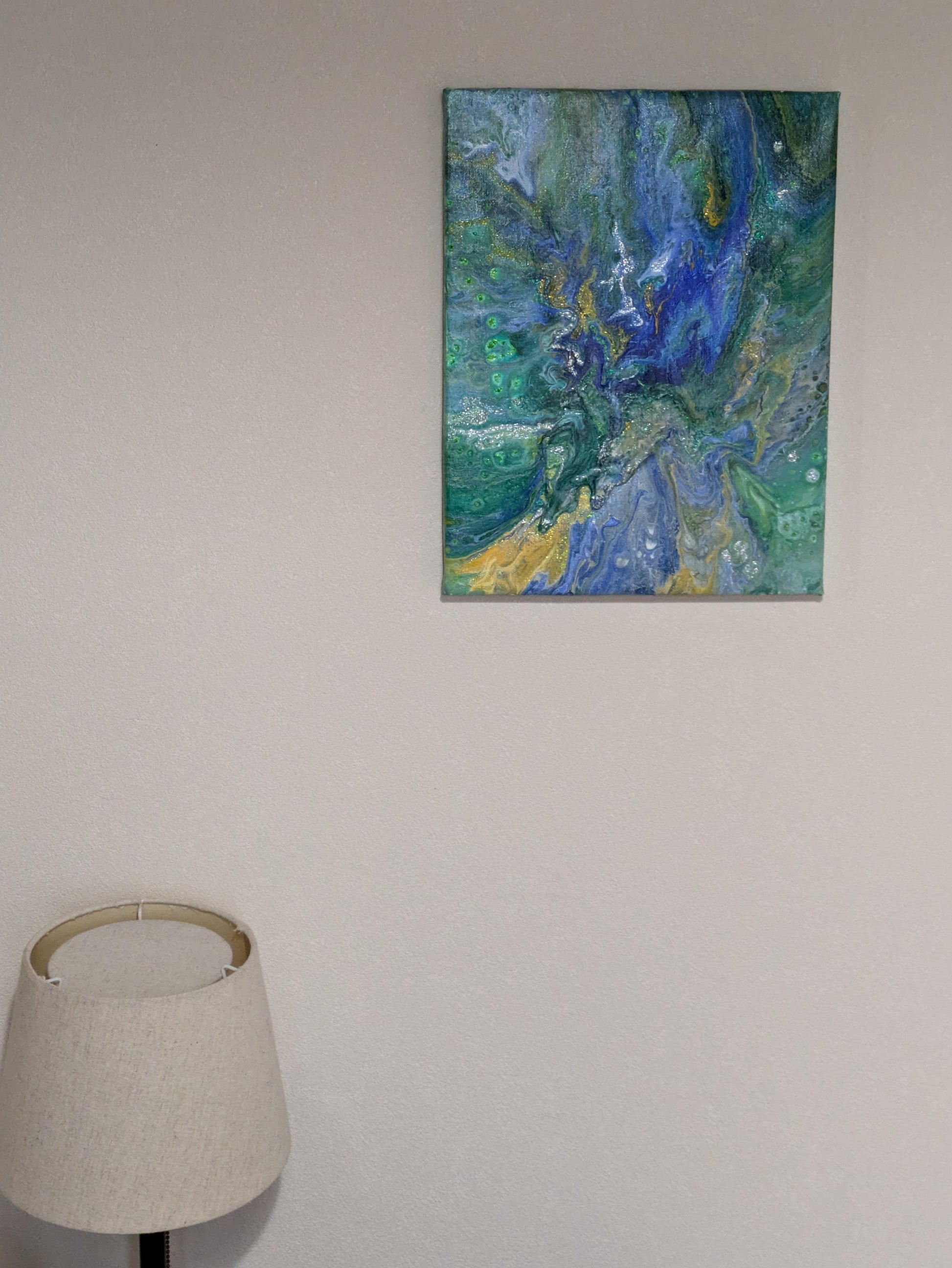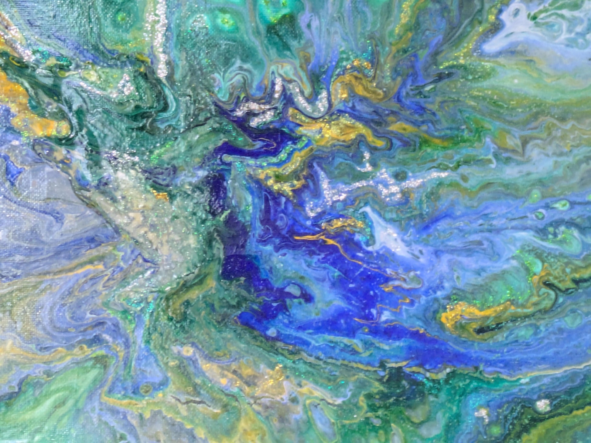 今のように具象画を描く以前にアクリル絵の具を使用して垂らし込み技法で作成したフルイドアートの抽象画です 題名は出来た作品のイメージに由来しています この絵に上下左右は有りません